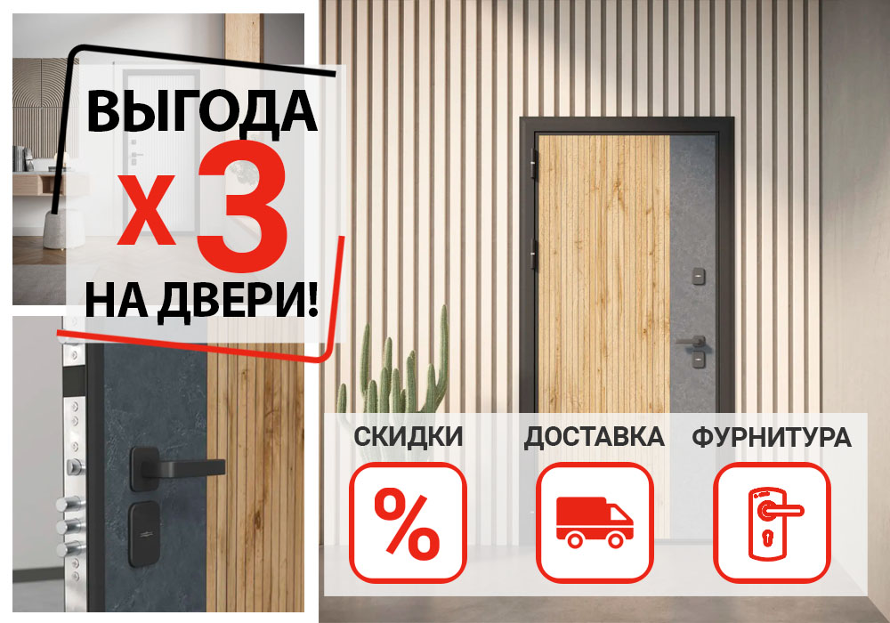 Тройная выгода на межкомнатные и входные двери в одном заказе. Скидка, бесплатная доставка, фурнитура в подарок!